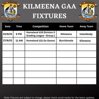 This weeks GAA fixtures!This week’s fixtures! Keep an eye on our social media for match updates ✨🏁 Please show your support! 👏🏼 #KilmeenaGAA2025 #KilmeenaGAA